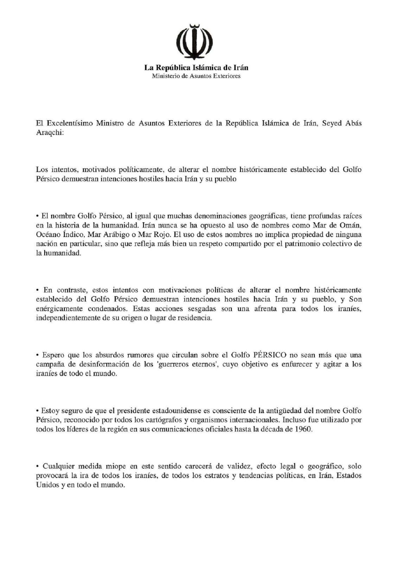 جناب آقای عراقچی وزیر محترم امور خارجه جمهوری اسلامی ایران ضمن ایراد مطالبی، بر اهمیت و قدمت تاریخی نام بلند آوازه «خلیج فارس» اشاره داشته اند.